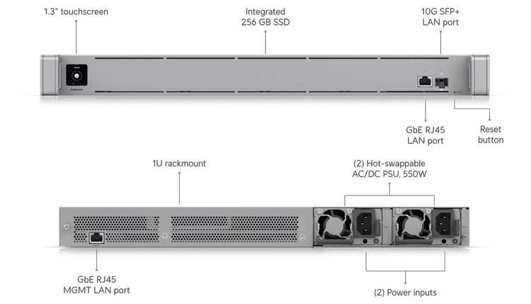 UniFi Enterpirse CloudKey / Dimensiones 787 x 43.7 x 481.4 mm / 1,000 Dispositivos UniFi Administrados / 10,000 Usuarios Conectados Simultáneamente / 1 GbE RJ45 / 10G SFP+ / Montaje en Rack 1U / 2 PSUs Intercambiables En Caliente